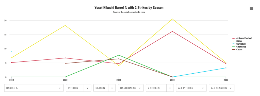 Not only this, but we can also see that this season, he was able to dramatically reduce the barrel rate in a two-strike count, meaning that Kikuchi was able to limit hard contact whilst being able to attack hitters more often due to newfound command and improved stuff indicated by improved spin rate on all his pitches.
