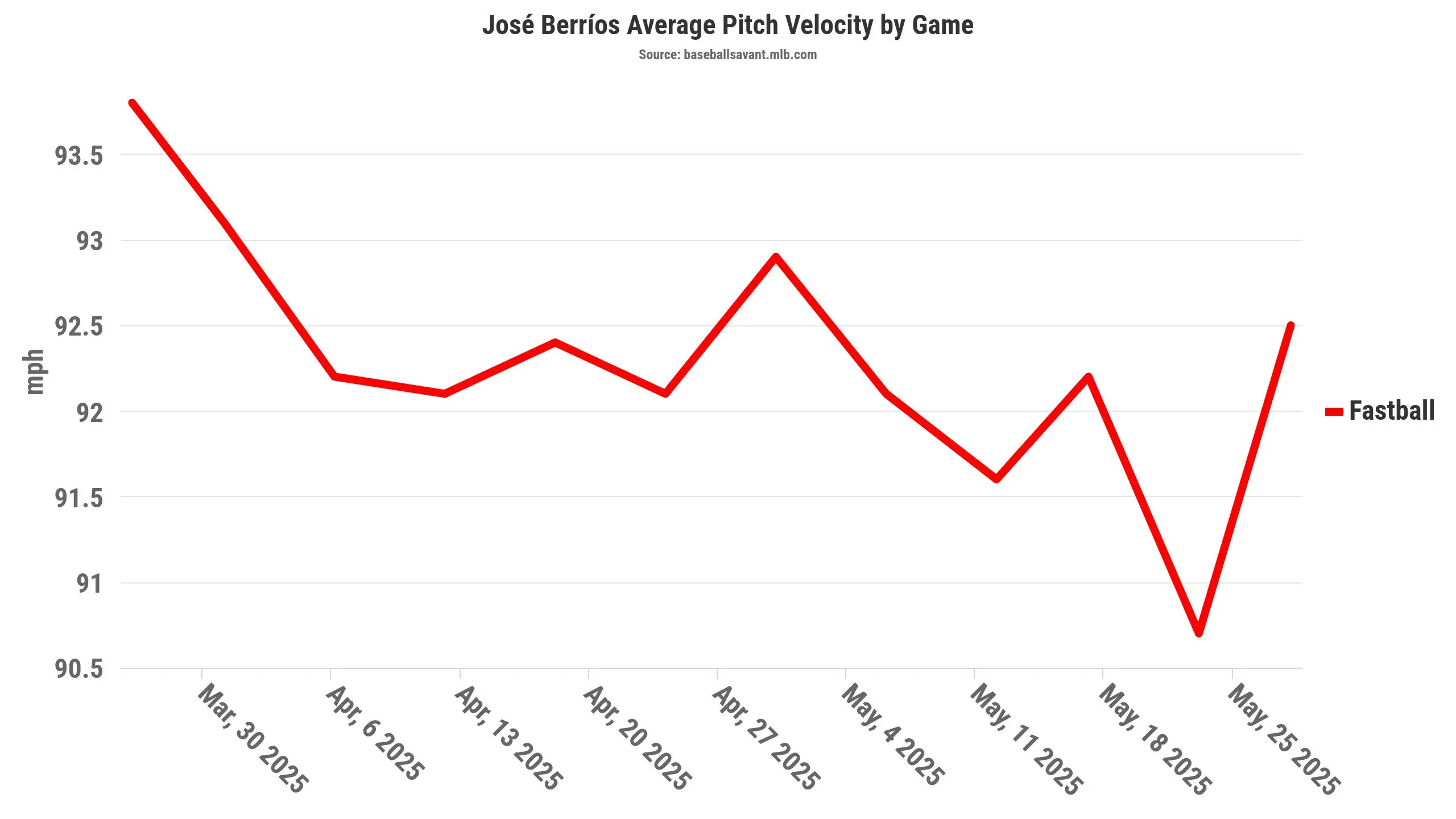 Further to Schneider’s point, Berríos’ average fastball velocity entered uncharted territory just one start ago, dropping to 90.7 m.p.h. — the lowest of his career, one decimal point below his previous mark set on July 31, 2019.